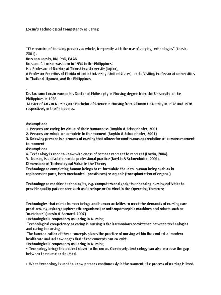 Schoenhofer technology and historical inquiry in nursing by alan bernard and angela cushing pictures of paradox: 10.2152/jmi.64.160 abstract the coexistence of technology and caring is best exemplified in nursing. Holistic nursing practice , pp. Concern has been established over the development of viewing nursing as an act of accomplishing tasks rather than an intelligent, thoughtful profession (locsin, 2001). Rozzano locsin's technological competency as caring and the practice of knowing persons in nursing. Locsin is the author of technological competency as caring in nursing (4.50 avg rating, 4 ratings, 0 reviews, published 2005), the evolution o. Locsin described nursing as technological competency as caring in nursing focused on the proficient practice of nurses using technologies to know persons as caring while affirming that being technologically competent is being caring. Locsin authored technological competency as caring in nursing: Rozzano locsin is 66 years old and was born on 05/25/1954. Nursing of older adults by rebecca a. Rozzano locsin sought to answer the question of 'what is a nurse' in light of the recent technological advances of medicine (locsin, 2001). Rozzano locsin's theory of technological competence as caring in nursing •to describe how the theory defines the nursing metaparadigm concepts •to discuss an abbreviated analysis of the theory •to explain the results of a study which incorporates locsin's theory Locsin) was born on 1954 in philippines, is a theoretical nursing: